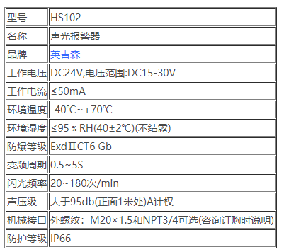 三、HS102防爆型小聲光報警器技術參數