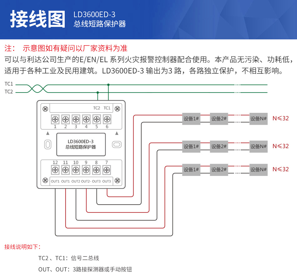 LD3600ED-3主要用于火災報警控制器的二總線回路中,隔離線路中的短路點,保證線路中的其他設備的正常運行。可以與利達公司生產的E/EN/EL系列火災報警控制器配合使用。本產品無污染、功耗低,適用于各種工業及民用建筑。LD3600ED-3輸出為3路,各路獨立保護,不相互影響。